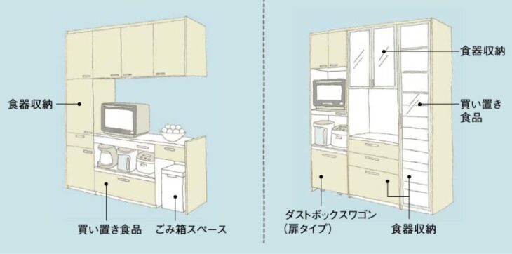 一方のオープンな見せる収納は、家電やおしゃれな食器などを飾ったり、すぐに取り出しやすいような機能的なメリットがある一方、生活が出やすい側面もあります。