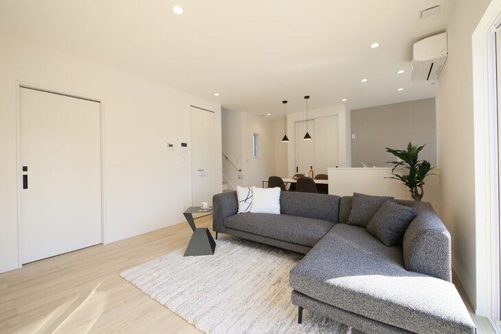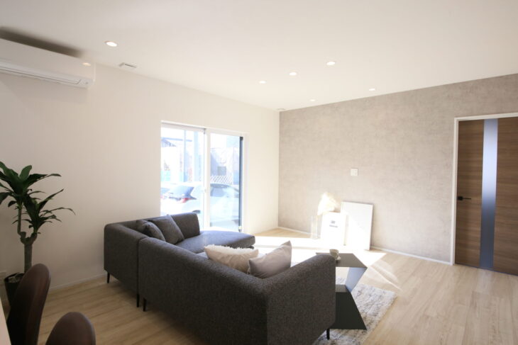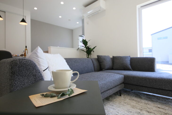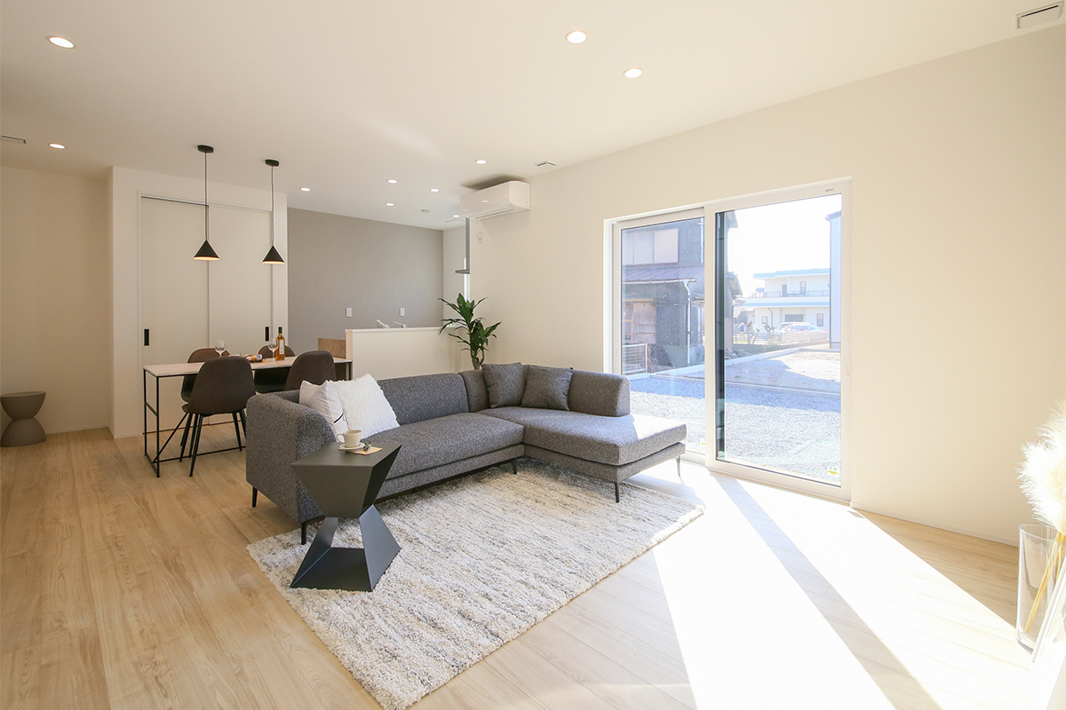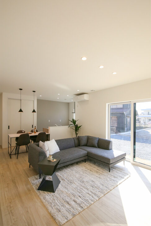 陽光がしっかり入るリビングにはL字ソファを配置してもゆったりとした空間になっています😊