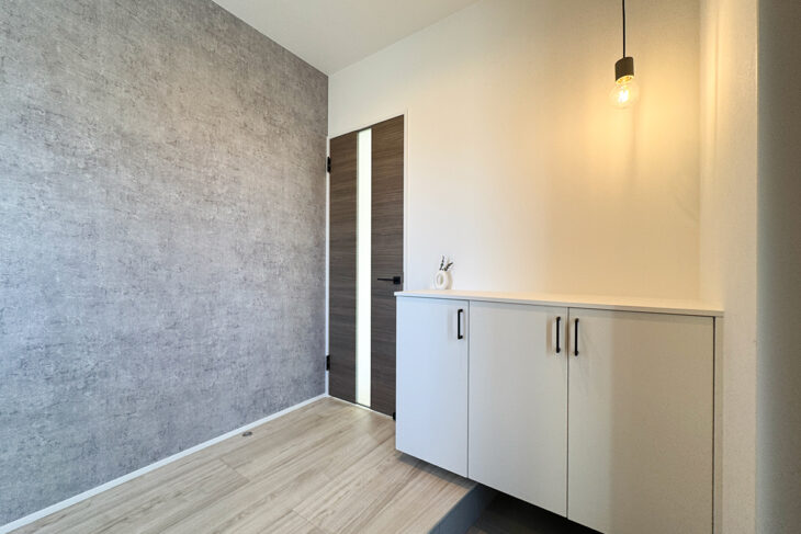 モルタル調のアクセントクロスと縦スリットのガラスが素敵なリビングドアが個人的にお気に入りです☺️