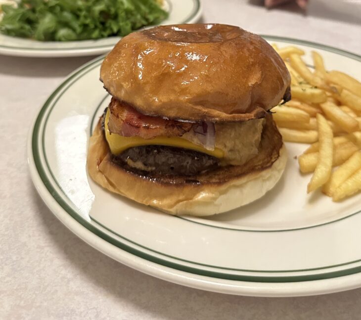 分厚くて肉々しい本格パティに、ジューシーなベーコンとチーズが相まって、、