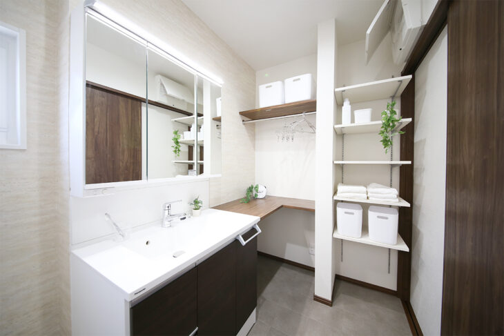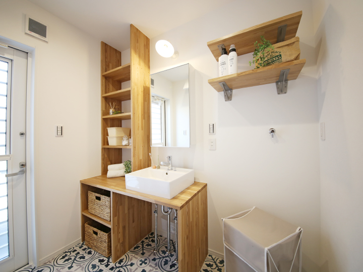洗面所って収納したいものが多いので、たくさん収納できるよう多めに設計。