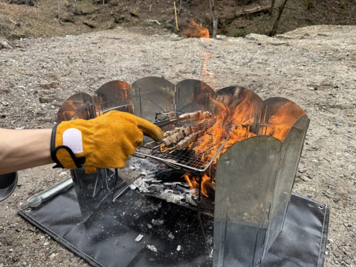 焚火をして、スーパーで買った串を炭火焼してみたり🍖🔥